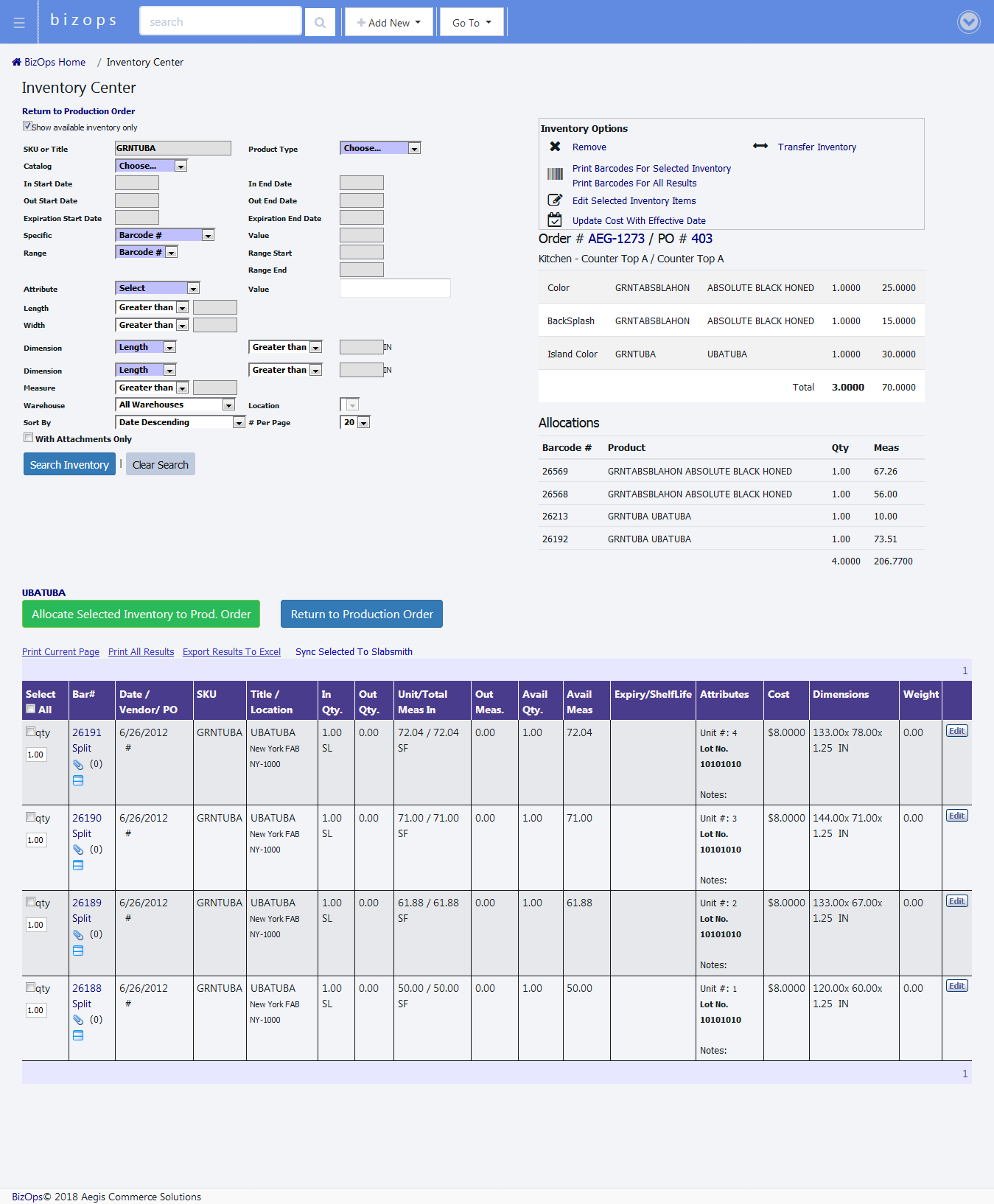 From the Production order, click on ALLOCATE / Add Stock & Allocate next to the Product line item. This will launch the inventory Center for that particular selection and if inventory is available it will show the inventory details.