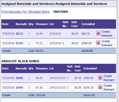 A remnant can be created for an allocated inventory item from the Production Order. Click on the Create Remnant tab. Add dimensions and inventory location and click update. The system will create a new inventory item and reduce the original allocation by the amount of the remnant.