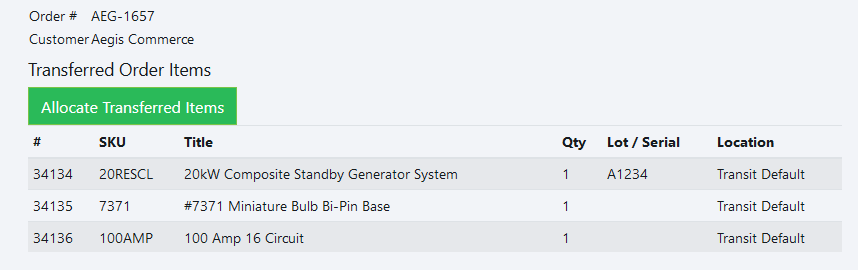 Click on Allocate Transferred Items and it will allocate the items and return to the order.
