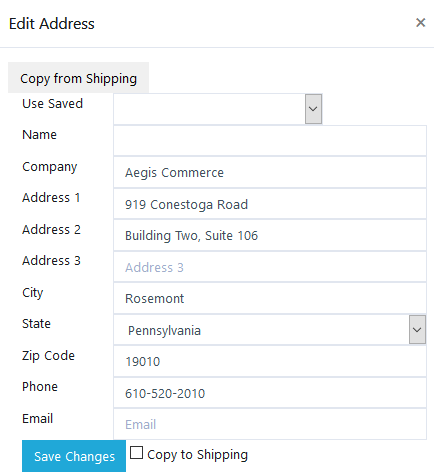 For billing and shipping info, you can enter new information, edit the existing information, copy from billing or shipping, and used saved address info if available.