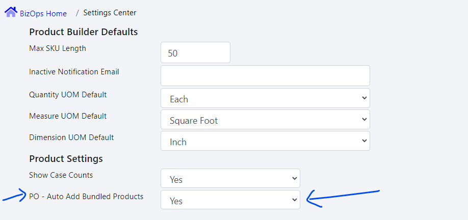The Purchasing function has been enhanced to auto order the bundled products when the main product is added to a PO. This is controlled by a System Setting as shown below.