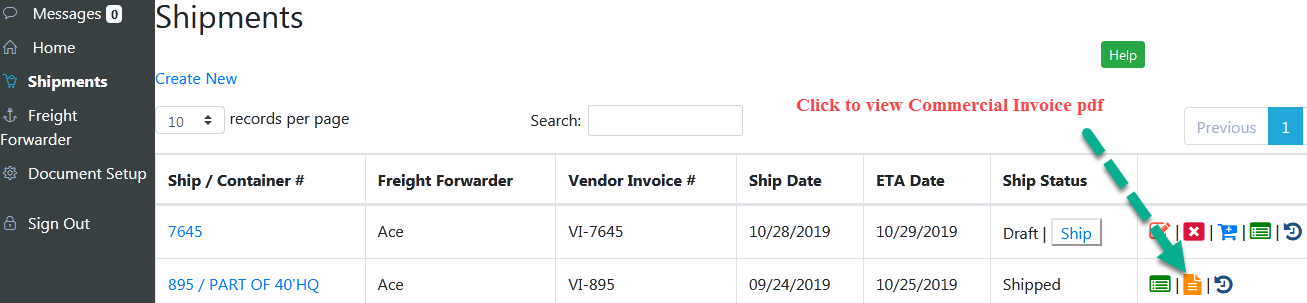 [1] Click on the Commercial Invoice's icon to view Commercial Invoice in pdf format. The icon will be visible only for shipped shipments.