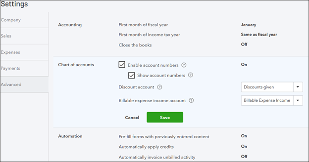 Under the Chart of Accounts section on the Advanced tab, make sure Enable account numbers and Show account numbers are both checked. If they are not, check them and click Save to update your settings.