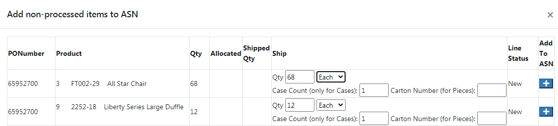 The Add functionality for Line Items on the ASN will be available after the generation of ASN. The primary purpose of this functionality is to add non-processed LineItem of that order to the ASN after it has been created and the labels have been generated.