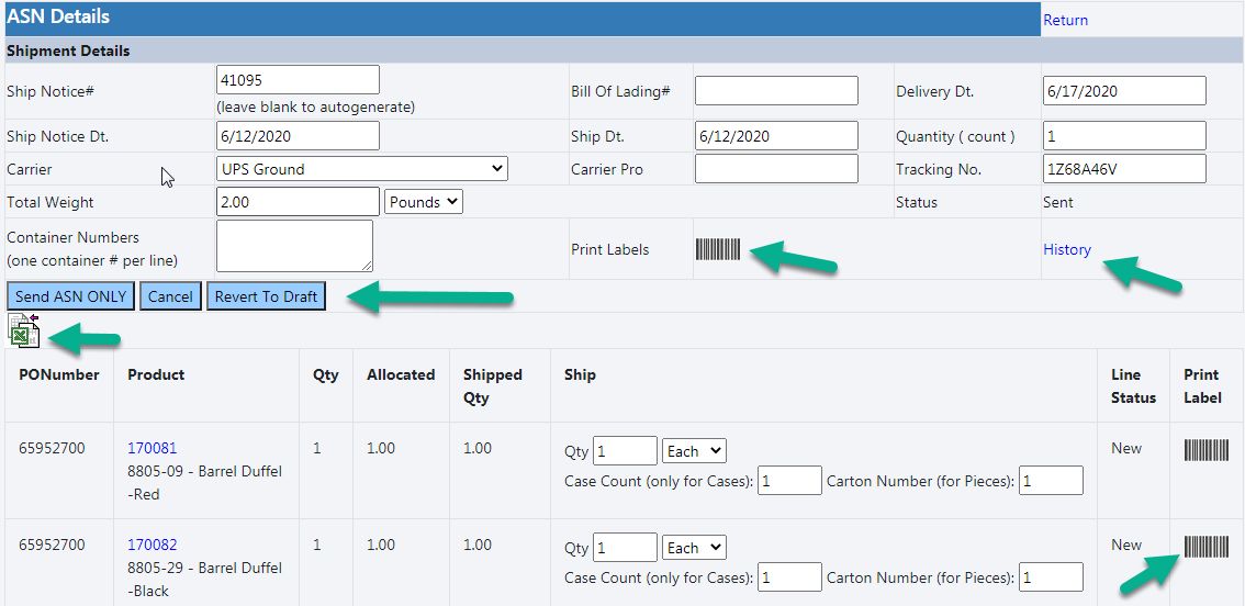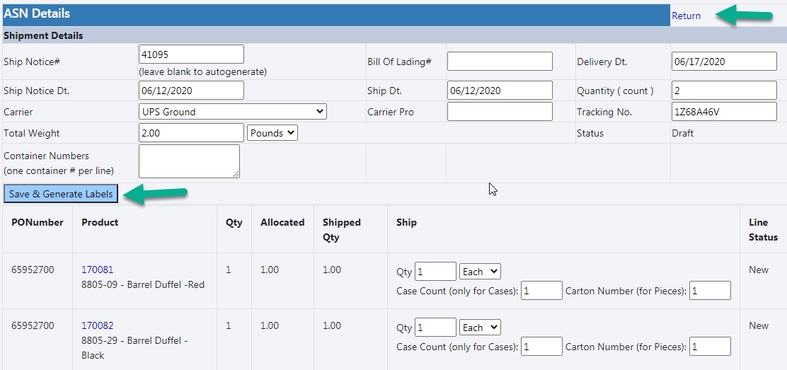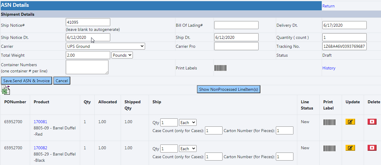 Update ( )- Updates quantity, carton count, carton numbers and re-generates the UCC Labels for that particular ASN Line Item.