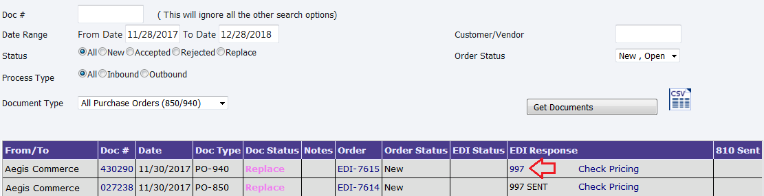Generate and send EASI-997 to the respective customer via ftp by clicking on 997 link.