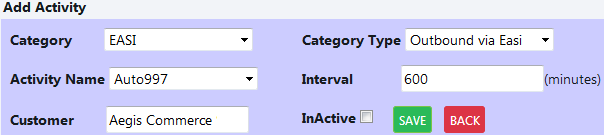 Select Category "EASI", Category Type "Outbound via Easi", Activity Name "Auto997", enter time interval in minutes, select customer and save the activity.