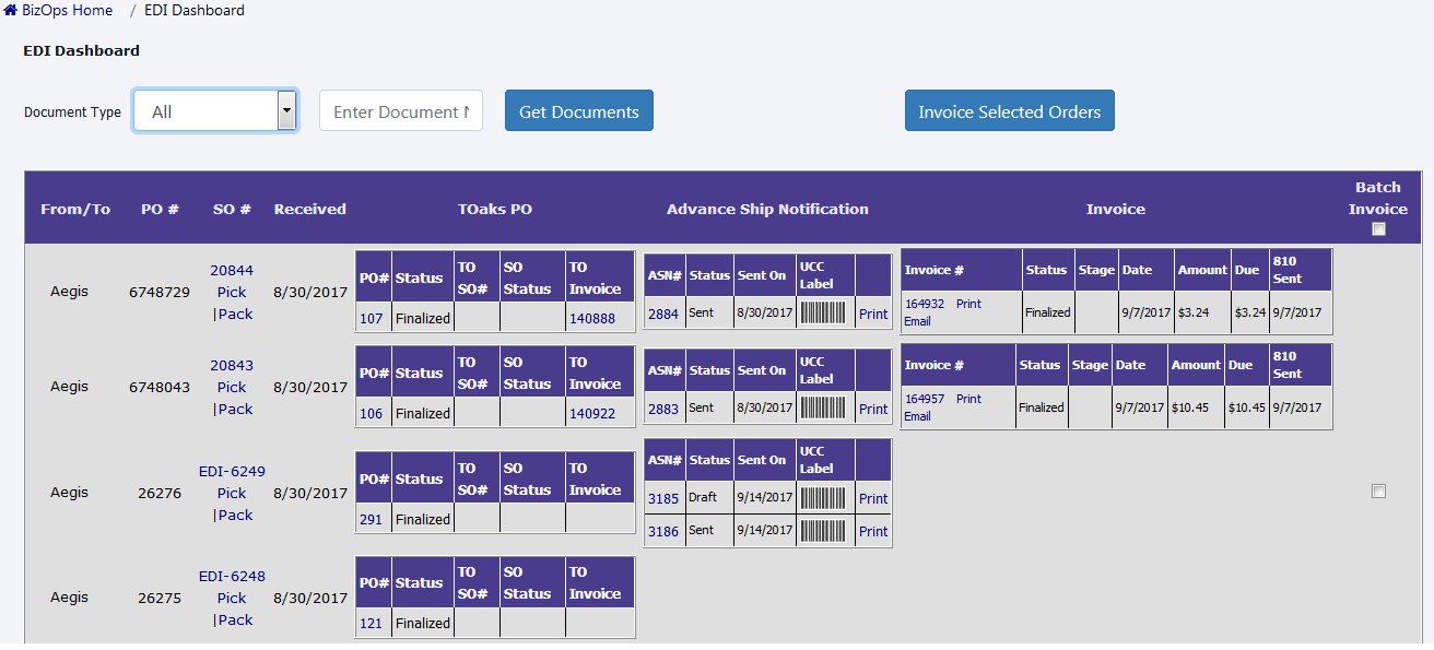 EDI-Dashboard provides all the details (i.e. PO details, ASN details, link to print UCC LabelInvoice details, link to print invoice, link to email invoice, option to create invoice for