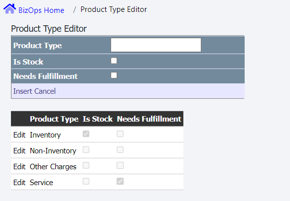 Every Product in Bizops has a Product Type. The Product Type Editor screen ( accessed from Admin-> Products-> Manage Product Types) can be used to setup additional attributes that apply to all Products of a specific type.