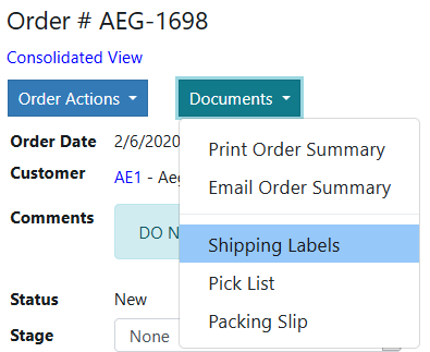 You can also access shipping labels from the Documents menu on the Order Info tab: