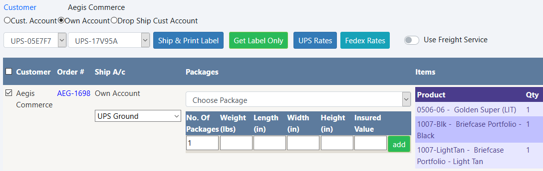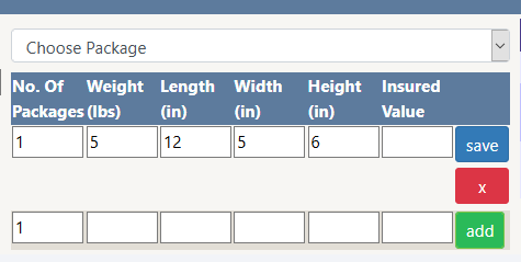 If you need to add another, just fill in the details of the additional line and click add. If you need to update an existing package, make the changes and click Save next to the package, or the red x to remove the package. A shipment must have at least one package, and you must at least specify the weight.