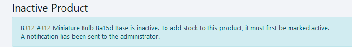 1) A user tries to Add Stock to an inactive product. Instead of the Add Stock page, they will see a message: