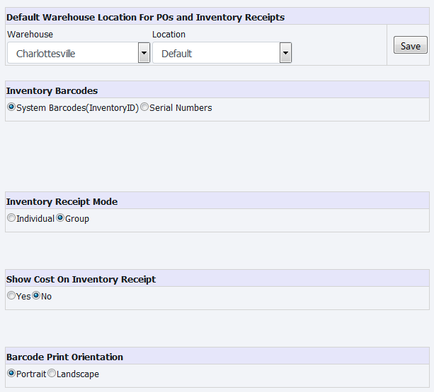 Here you can define default values for warehouse, location, field used to create inventory barcode, inventory receipt mode, visibility of cost on inventory receipt and Barcode Print orientation.