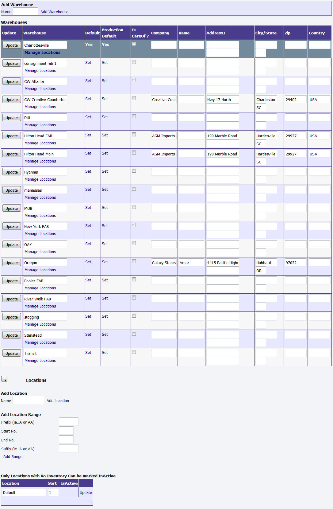Warehouse for receiving the inventory can be added from here. Also the locations can be managed for each warehouse from here. A location or range of location can be added.
