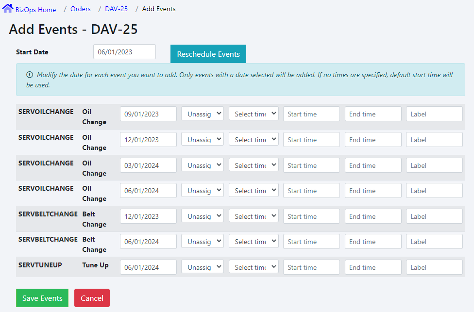 Create Events for the services and assign resources to the Events using the Event and Resource manager functionality in Bizops.