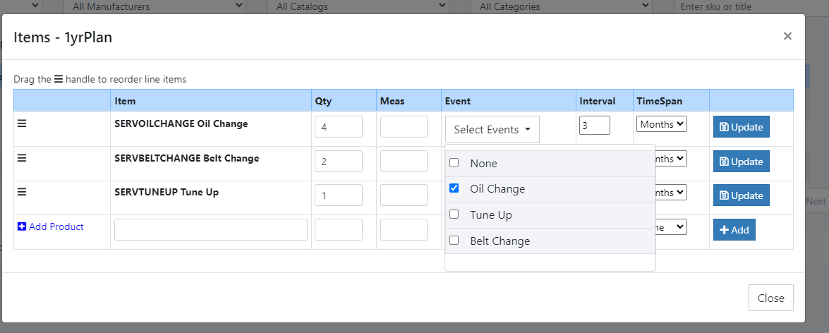 Configure each Item (SKUs) within the template will to have the count (quantity) of the service (for the duration) , the Events(s) that need to be scheduled and their frequency.