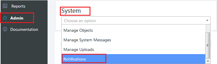 [1] Go to the Admin -> System. Select "Notification". It takes you to the Notification page.