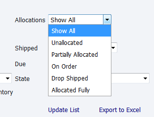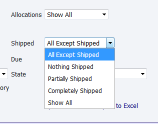 The following screen shots show the two major drop down boxes and their selections. The illustration below shows the drop down selection for Allocations. The following illustration shows the drop down selections for Shipped.
