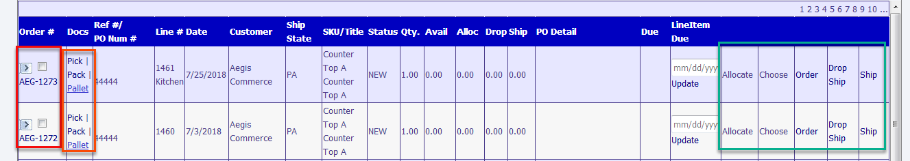 The Red Box shows the check boxes which provide the power of fulfilling multiple orders at a time.The Orange highlights the pick and pack features. The Cyan Box allows for different methods of allocation. In the order number column for each line item there are two selections that use to process multiple product allocations at a time, either internally to an Order or externally across several Orders. The user can select the check box on any line items. To further speed up the selection, the > (greater than sign) which checks all the check boxes in that Order. This allows for the selection of either all the line items in a particular order or for individual line items either in a particular order or across orders.