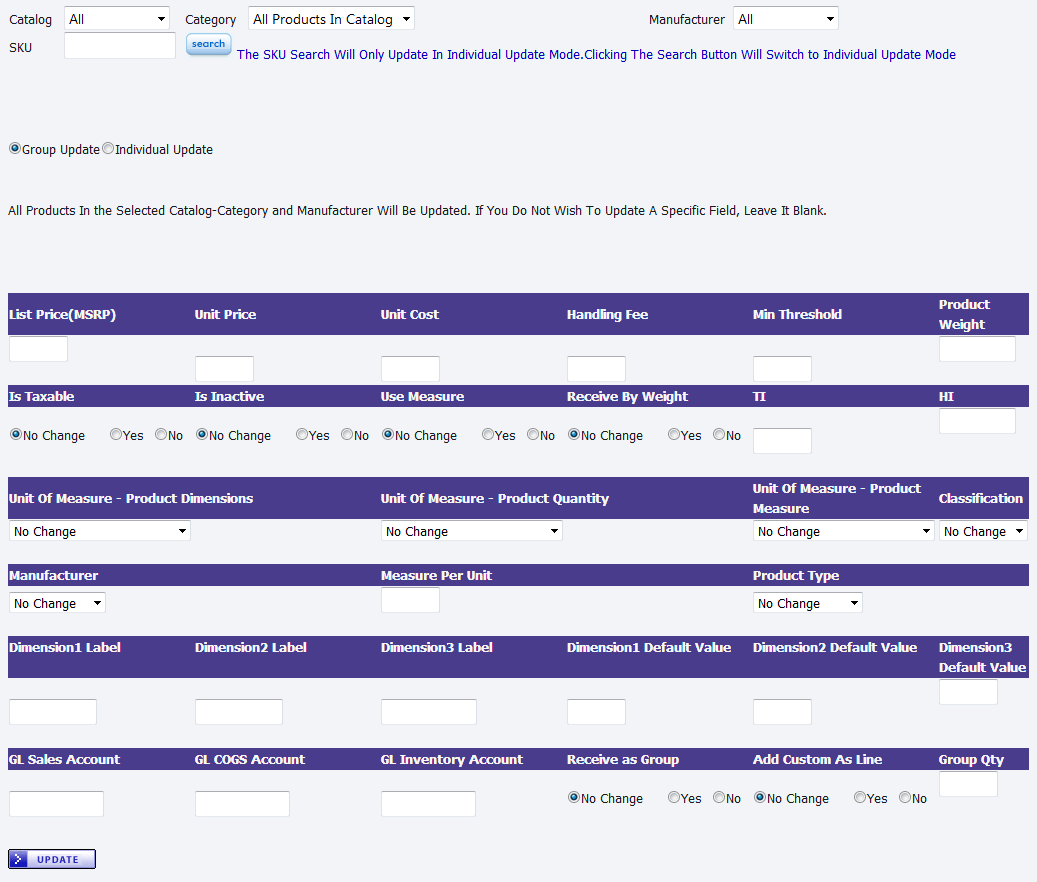 With the bulk update page you can update the properties of the product in Bulk (entire Catalog or Category) or Individual mode by clicking on the Radio button for individual or group update.