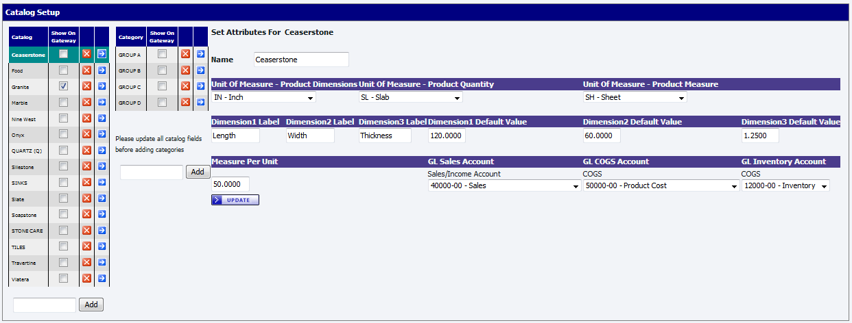From this screen the Catalog can be set-up into respective groups for example Granite, Silestone, Services etc. Also by clicking on the blue arrow you can further sub categorize that catalog for Ceaserstone into Group A, Group B, Group C and Group D. The Catalog and Category setup needs the default settings for the product to be setup, so when the new product is added to the catalog/category it takes the default values setup on the Catalog and category. This represents the process to create the Catalog but then you have to add products to that catalog.