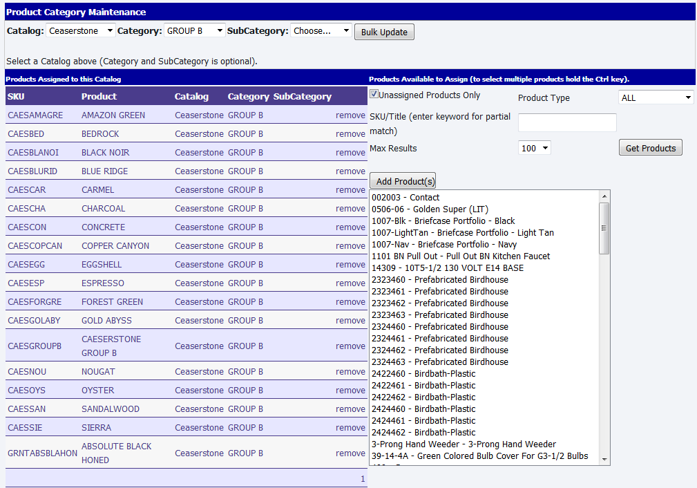 From this screen the user can select from the dropdown ‘Catalog’ and ‘Category’ in which you want to add products. On the right side is a list of all the products in the system. Select the products from the right side (you can have multiple selections by Ctrl+click) and then click on ‘Add Products’ those products will be added to the specified Catalog and Category.