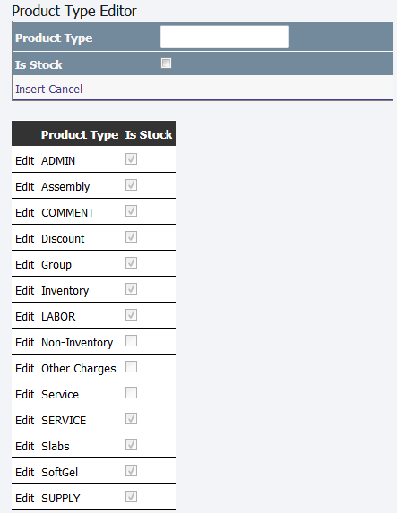 On this page, you can add / edit the product type. For example, product type can be Inventory, Non-Inventory, Assembly, Service, Discount etc.