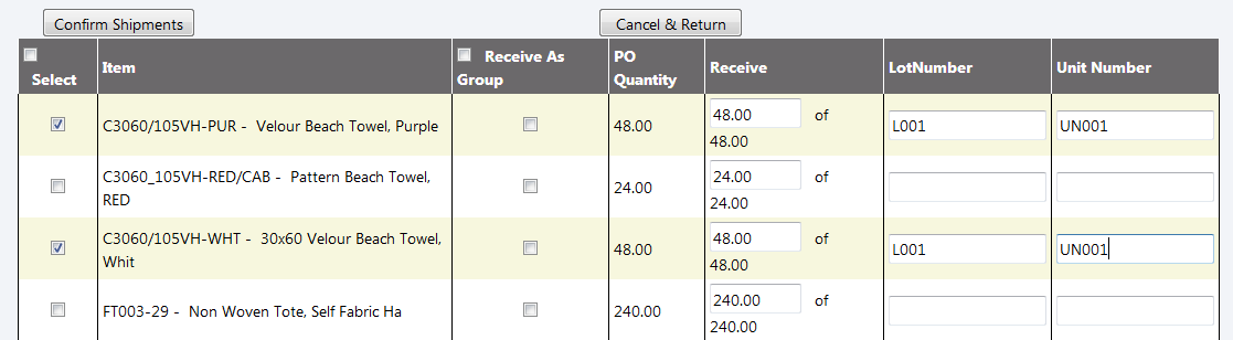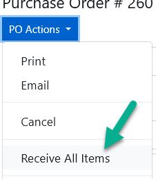 To receive items, you can select Receive All Items from the PO Actions menu. This takes you to confirm receive PO page. Here adding required details you can confirm the shipment.