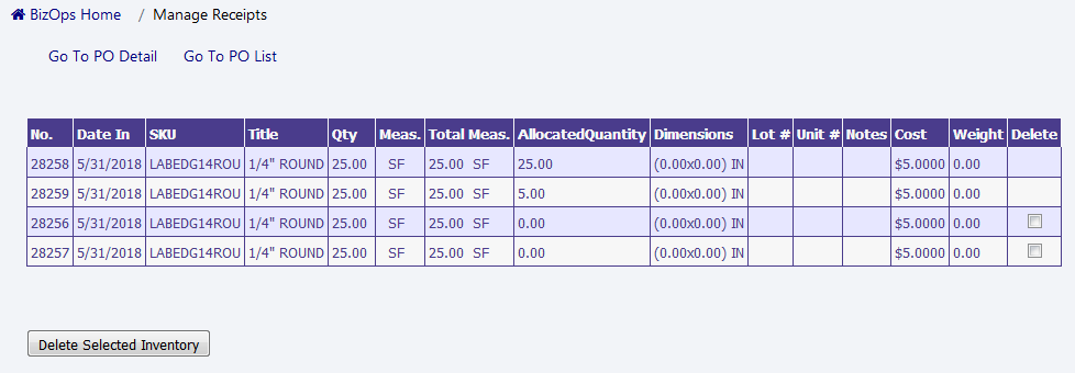 On clicking Adjust Receipts takes you to Manage Receipts page. Here you can delete the selected inventory.