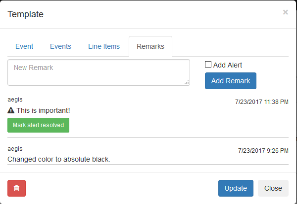 If a remark has been added as an alert, it will have an alert icon on it. You can click on a remark (or the word none on events without remarks) to view/add remarks to the event.