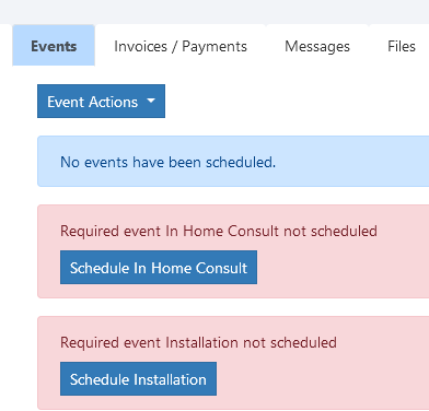 If a requirement has an associated event and it has not yet been scheduled, a warning shows on the Events tab of the order/quote:
