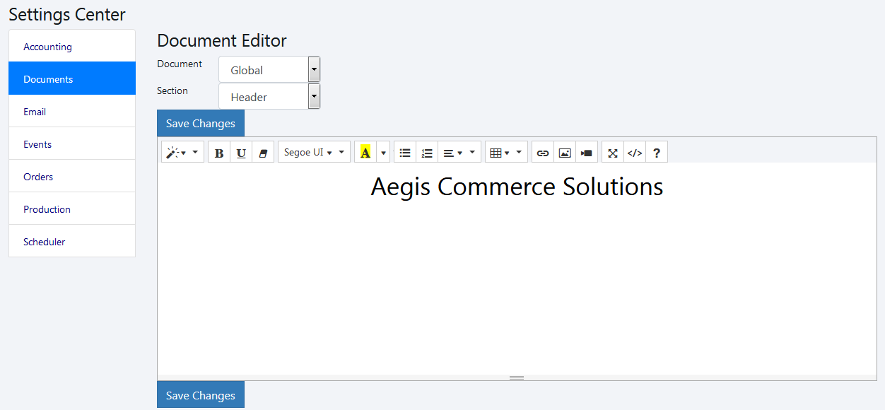 From this screen you can setup the headers and footers to be printed on the Quotes/Orders/Invoices etc. You can setup the document individually or you can setup for Global which applies to all the prints.