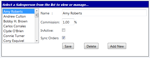 Here you add new sales person name with commission by Clicking on ‘Add New’. You can mark the sales person inactive by clicking on the check box.