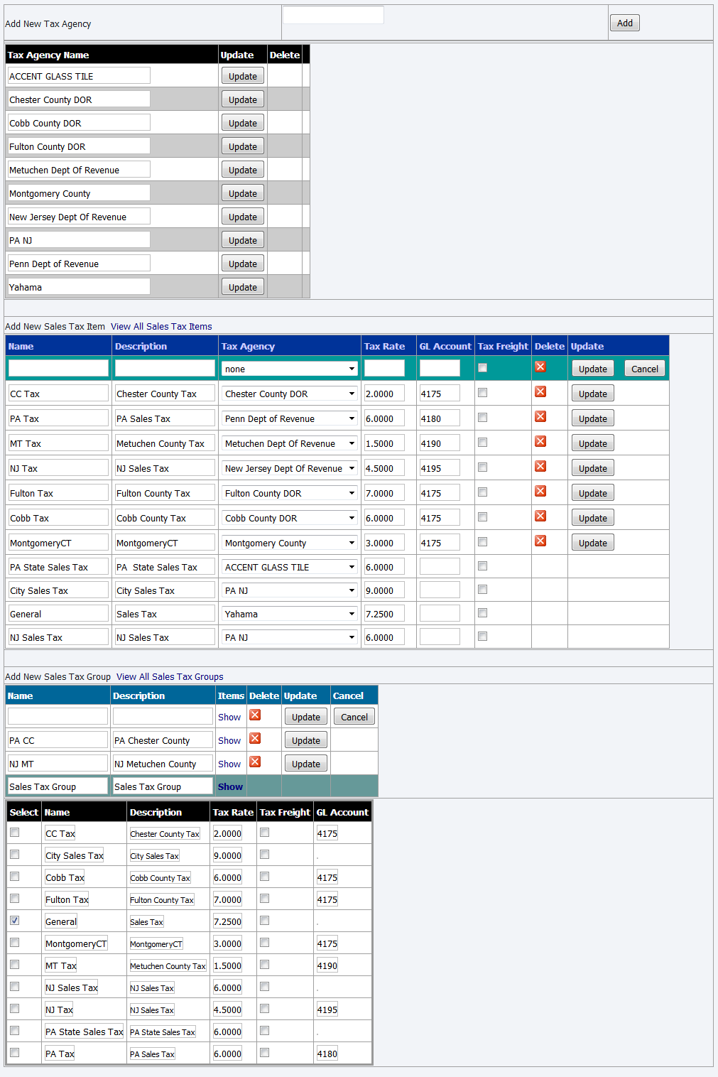Here you can add / edit Sales Tax Agency, Sales Tax Groups, Sales Tax Items with Tax Rate and Account Number.