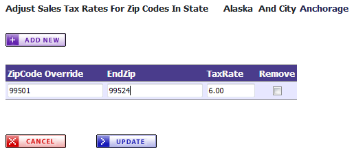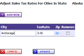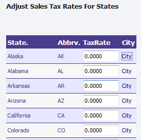 From this screen you can specify the Tax rate based on state. If you want to overwrite a tax based on city then click on City to specify Tax rate per city and further down on the page tax rates for the zip codes by clicking on Zip within a city.