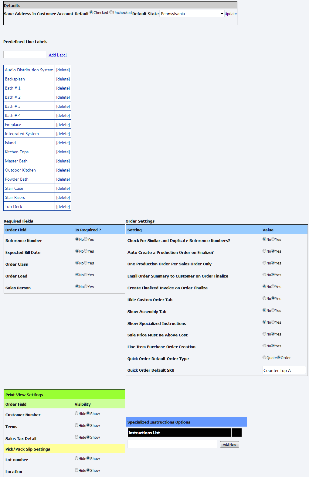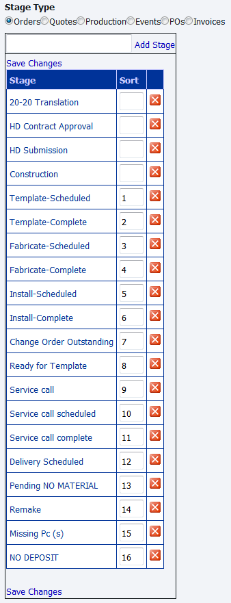 You can setup stages for each Quote, Order, Production, Events, POs and Invoices from this page. The stage is then used to identify the process. So it is easy to know which stage the activity is going through. The stages can be sorted based on the number and deleted as well.
