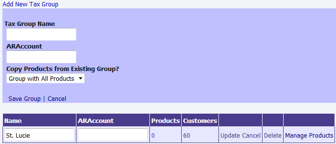Here you can add / edit / delete Tax Group. You can save receivable account number and add products under this tax group. By clicking on Manage Products link takes you to manage tax products page. You can add or delete products for that particular tax group.