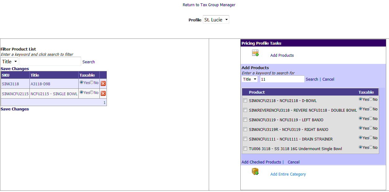 You can add individual products or an entire category of products from this screen by clicking on respective links ‘Add Products’ or ‘Add Entire Category’. Then you can define the products as Taxable or Non-Taxable by clicking on the radio button. For example, if a product is taxable then a tax will be automatically rendered to the Sales Order/Quote for this customer. The tax is based on shipping address of the customer. The Tax is determined from the Sales Tax Rate Manager. If the product is not taxable then the tax will not be calculated for that product on the sales order.