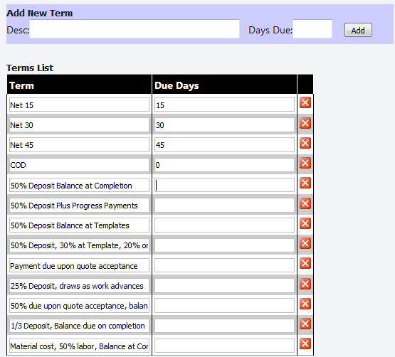 Here you can define the terms with due days which you can be assigned to the customers which will be set as default terms for that customer. Also you can change the term for a particular quote/order by changing the terms on that quote/order.