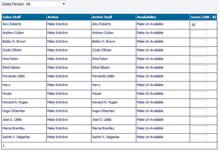 On this page, you can make a sales staff inactive or active staff unavailable. You can also set a score for a sales staff.