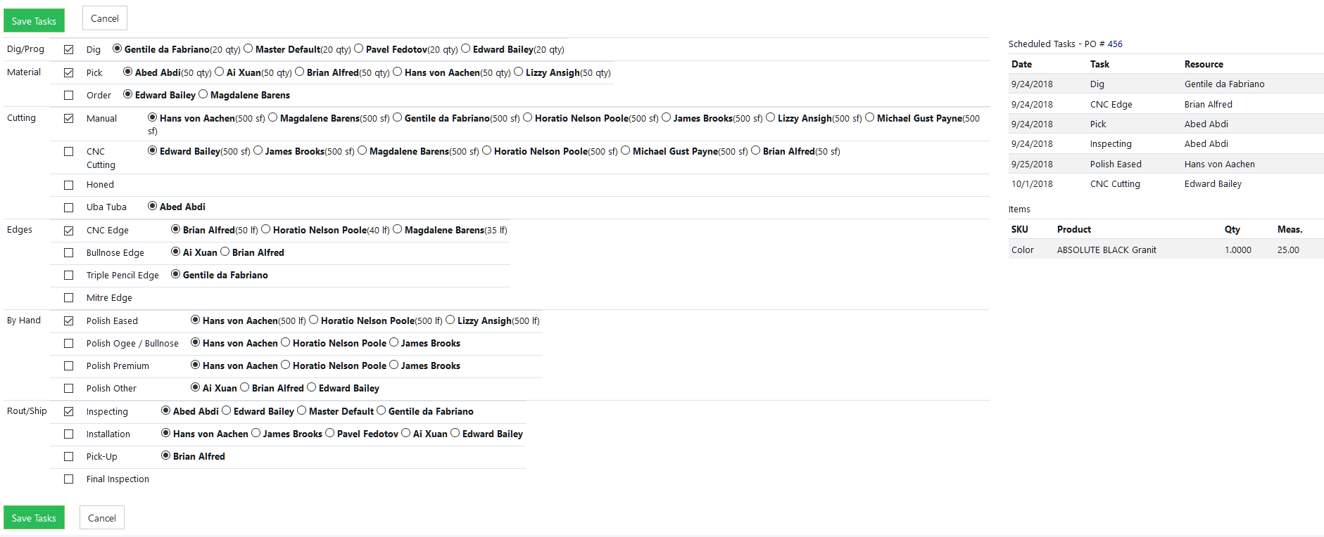 The default tasks in each Task Group will be automatically checked and a resource selected. If the custom order contains SKUs that have special tasks assigned to them, those tasks will be checked instead.