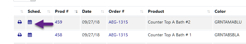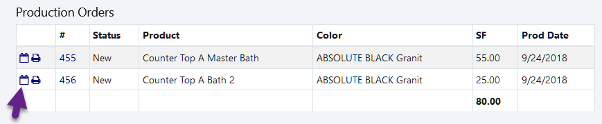 - From the sales order detail page, click on the calendar icon next to the production order in the Production Orders section at the bottom of the order: