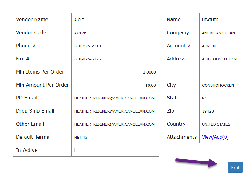 This will take you to the vendor screeen. Click Edit to edit the vendor details: