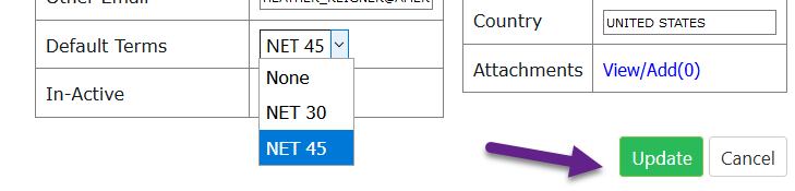 To set the default PO payment terms for a vendor, search for the Vendor in the vendor list on the Purchasing home screen and click on the Vendor name.