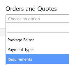 To manage requirements for orders and quotes, go to Admin-->Orders and Quotes and select Requirements.