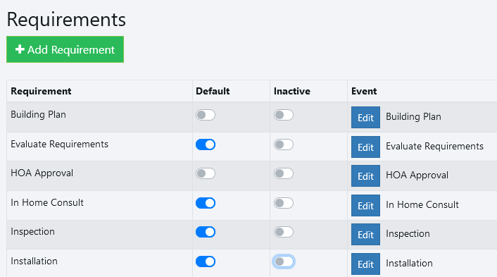 On each requirement, the Default option selects whether the requirement is turned on by default on a new order/quote. Inactive turns off the requirement from appearing.