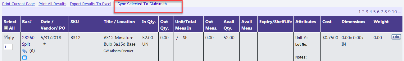 We have added a new function within the Bizops inventory center that enables slabs in Bizops to be moved from Bizops to Slabsmith. This process involves clicking on the check box within the inventory item that needs to be moved to Slabsmith and then clicking on sync selected to Slabsmith. An example is provided below;