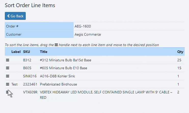 This will take you to a screen showing the line items. You can drag and drop the line items to sort them, as shown:
