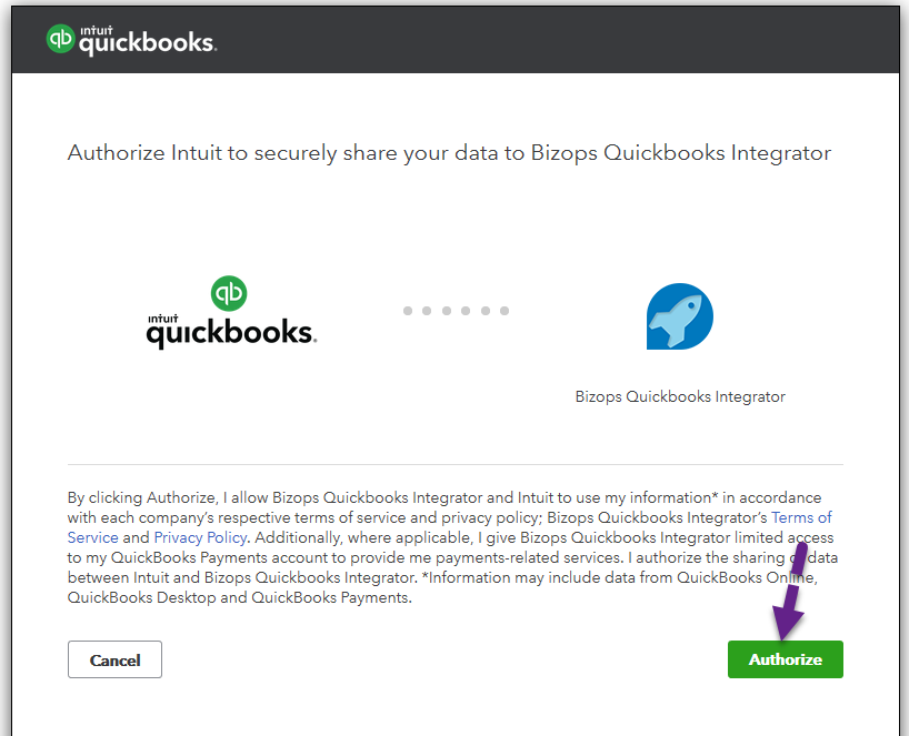 Once you have signed in, you will be asked to give Bizops authorization to access your Quickbooks Online account: