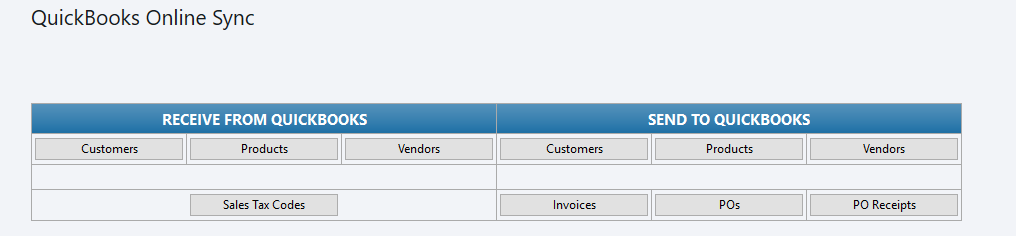 This is where you sync different types of data and transactions. Please see the important note below. You click on the type of item you want to sync (Customers, Products, etc..). There will be a slight delay while the data is being sent and processed, and then you will see a message stating how many of the item you selected were synced (Invoices added: 8, for example). If there are any issues you will also receive a message detailing the problem.